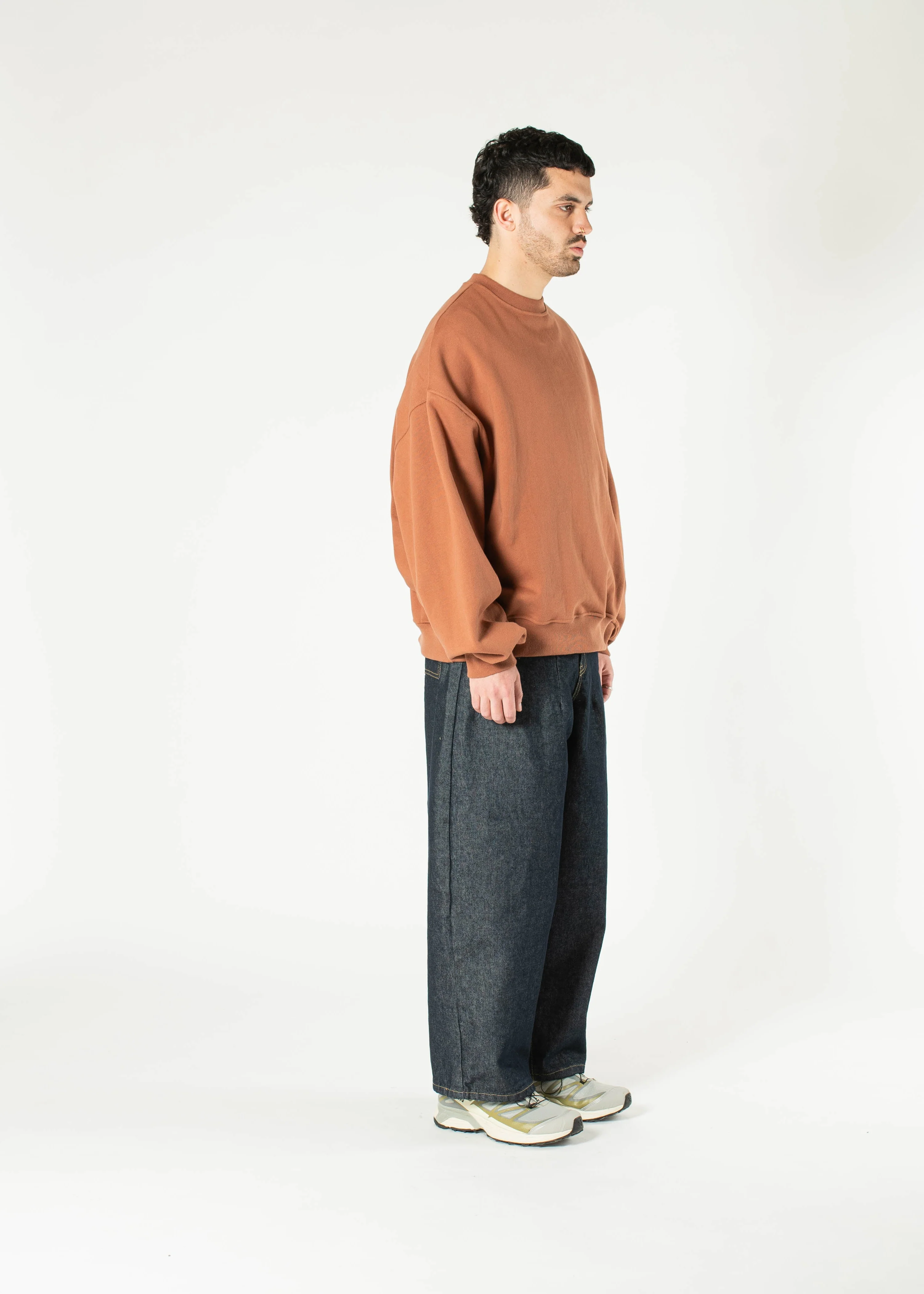 This orange crewneck has an oversized fit. Pleat details at back. French Terry heavyweight cotton for maximum coziness. It comes in one size.